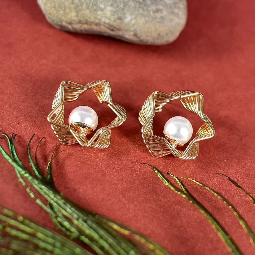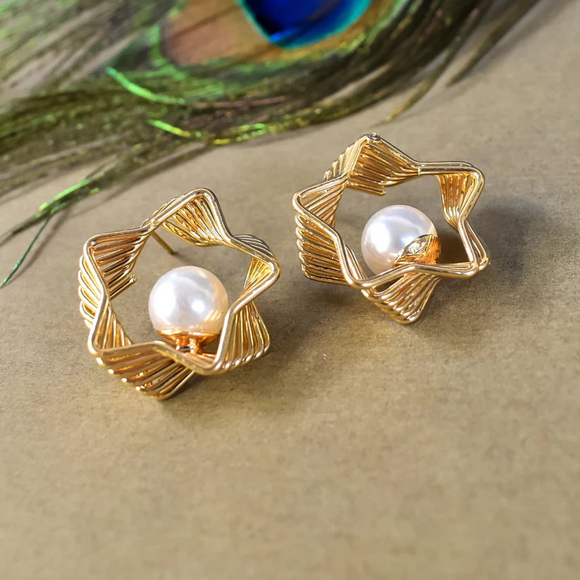 These luxury star-shaped gold earrings feature a lustrous pearl centerpiece, beautifully framed in an intricate designer setting. Crafted with precision, the gold-toned finish enhances its charm, making it a standout accessory for both modern and traditional outfits. Lightweight and stylish, these earrings offer timeless beauty and effortless elegance.